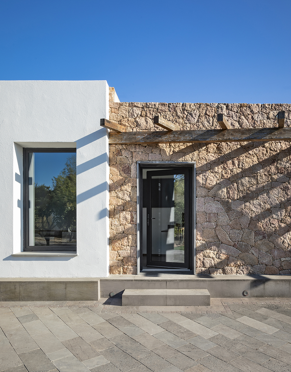 Il progetto tiene conto del contesto territoriale in cui si trova e gode della mitigazione costiera, con temperature minime d'inverno più alte e massime in estate inferiori rispetto alle aree interne. Tutti gli spazi sono progettati per dare risalto e godimento all'esterno che, per via del clima, si può godere attivamente per 8 mesi l'anno. Da ogni bucatura, sia vetrata o finestra, si ammirano scorci differenti del landscape design esterno. I rivestimenti del fabbricato sono materiali locali, le tre pietre tipiche della Sardegna: il tufo di Sassari, il granito rosso gallurese e il basalto di Paulilatino.