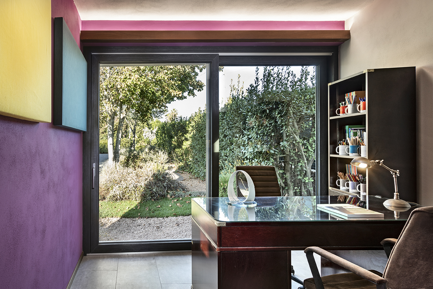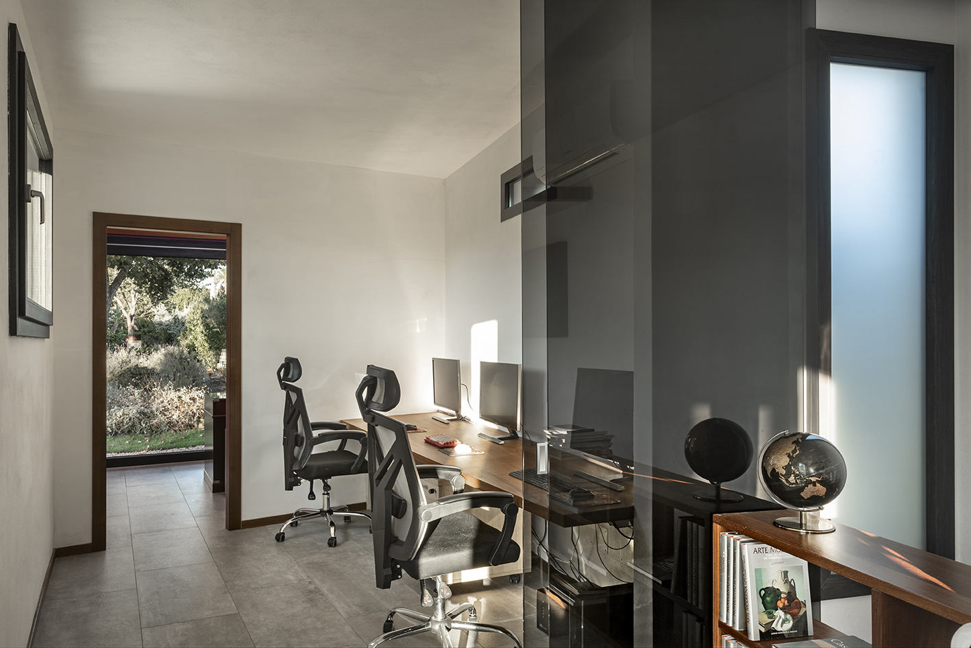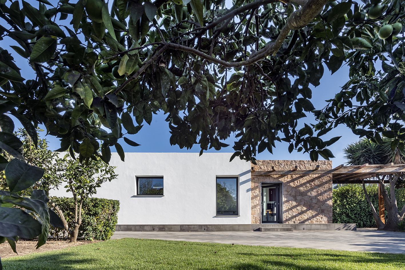 L’edificio si trova a 3 Km dal mare all’interno di un contesto rurale. La costruzione, adibita ad atelier d'architettura e paesaggio e interamente in Ytong termoisolante, è rivestita di granito e basalto, mentre per gli infissi in PVC è stata scelta una colorazione che crea continuità fra i materiali. Gli arredi, disegnati dal progettista, esaltano i materiali, la luce e il legame con gli spazi esterni. In particolare la scala in legno locale e acciaio che collega i due livelli si interseca con la scrivania del livello inferiore, trasformando il piano di lavoro in piano di calpestio. La grande vetrata affaccia su un giardino perenne che non necessita di manutenzione ed è costituito da una collezione di elicrisi, salvie, dicondre argentate, allori, donando profumi e colori.